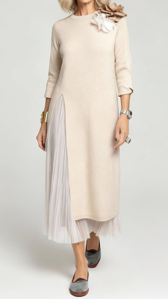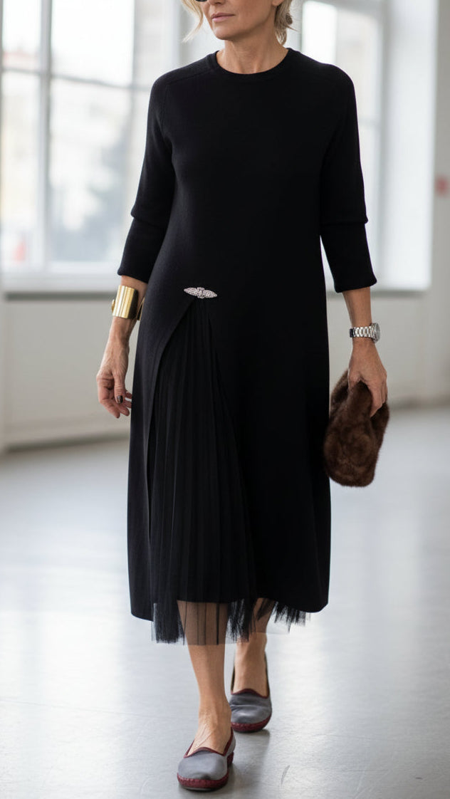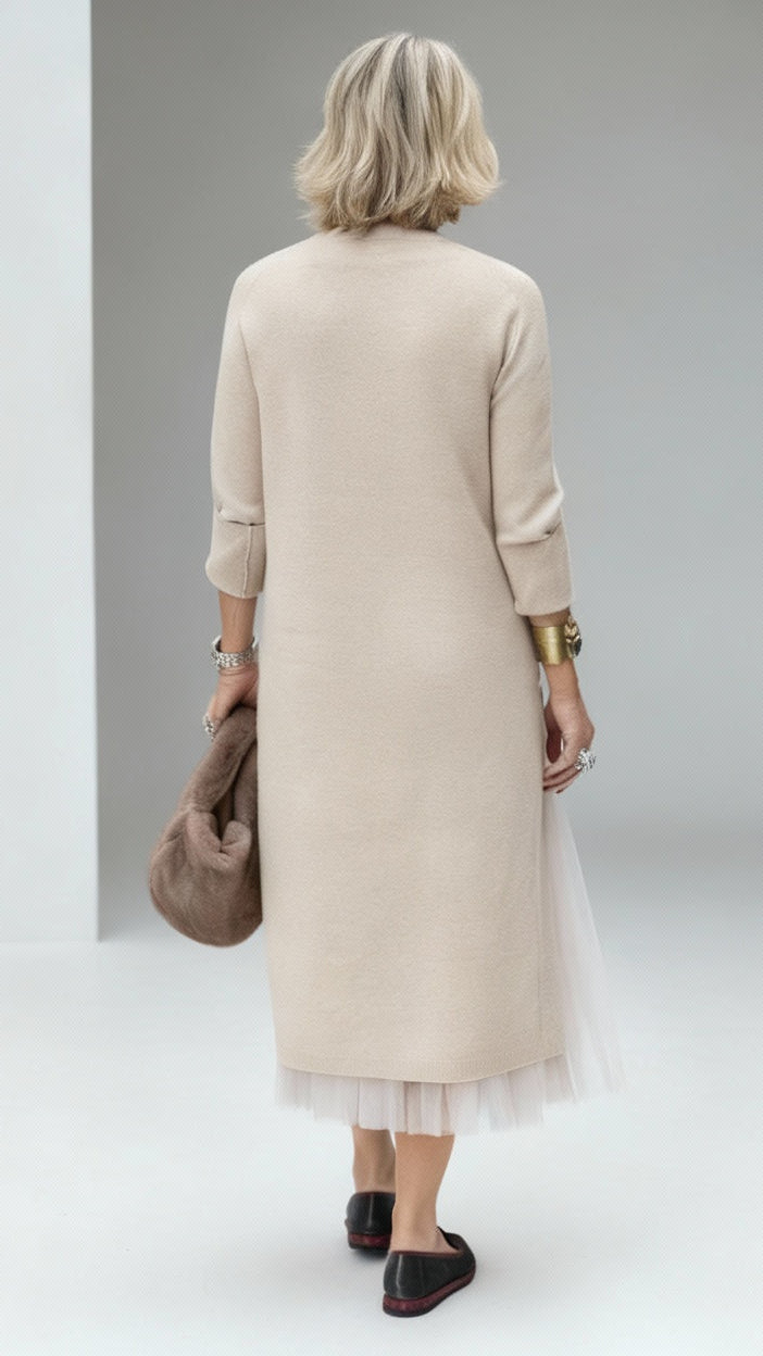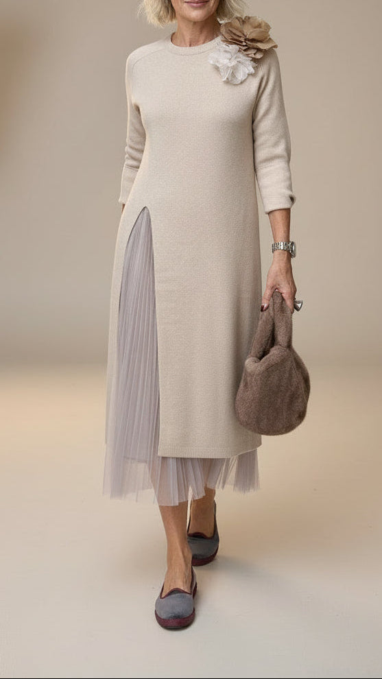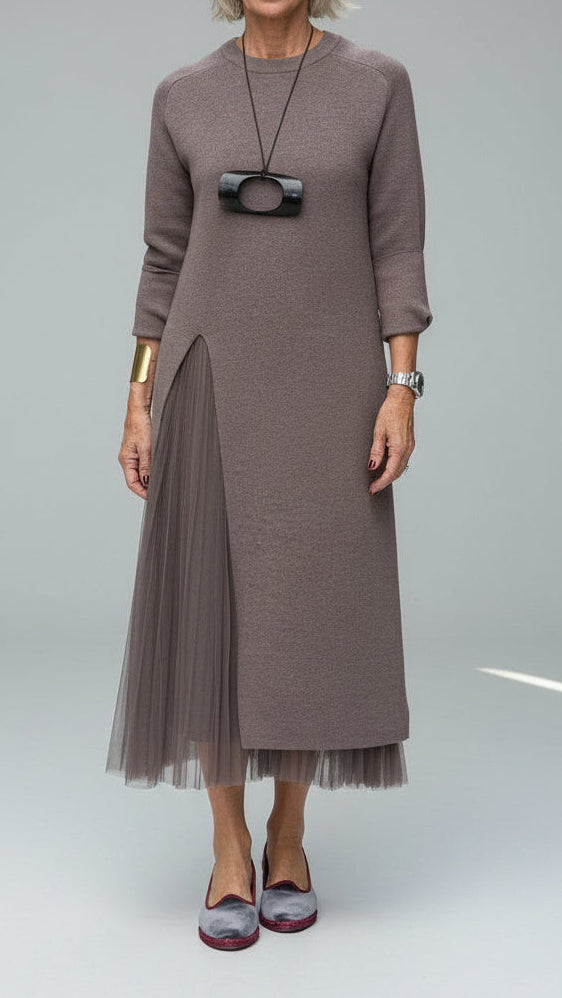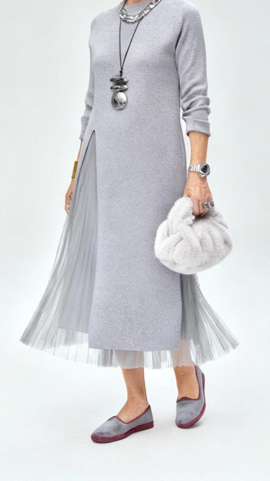 Realizzato in maglia e tulle di alta qualità, questo set assicura respiro, comfort e durata. Il girocollo classico e le maniche lunghe rendono l’abito ideale per la stagione autunno/inverno, mentre il tulle morbido aggiunge volume senza appesantire. La lunghezza al polpaccio offre equilibrio e femminilità, rendendo questo outfit adatto a tutte le età e a tutte le morfologie.